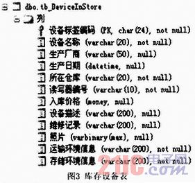 后臺數據庫微軟公司發布的數據庫引擎:Microsoft SQL Server 2005。該數據庫存放所有的倉庫設備信息和環境信息。數據表包括設備入庫、出庫、借出、歸還、庫存、盤點表;倉庫、供應商、讀寫器、用戶信息表;設備類型表。每個表中都包含了由RFID系統傳輸的EPC編碼以及用戶存儲區內的附加信息,WSN系統傳輸的環境信息。圖3是庫存設備表的邏輯結構設計。