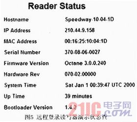 讀寫器設置:使用RS232/485連接讀寫器與上位機,串口通訊軟件Tera Term對讀寫器進行控制:串口設為COM1,波特率設為115200,頻率為860-960MHz,成功登錄后為讀寫器設置靜態IP地址:config network ip static<210.44.9.158>,遠程登錄:使用瀏覽器遠程登錄讀寫器http://speedwav-10-04-ld.local/,成功登錄后可演示屬性狀態查詢以及標簽的讀寫。圖5為查詢讀寫器狀態顯示結果: