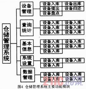 網站主要分為五大功能模塊:設備管理模塊、查詢統計模塊、基本信息模塊、系統設置模塊、數據管理模塊。每個模塊包括若干子模塊。倉儲管理系統主要功能模塊如圖4所示。