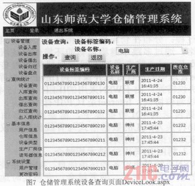 用戶首先進入倉儲管理系統的登錄頁面:Logiraspx,根據自己的用戶角色填寫用戶名、密碼、登錄類別進行登錄。登錄成功后進入系統主頁面:Main.aspx。主頁面最左側有五大功能模塊的導航菜單,點擊可進入相應頁面進行相關操作。圖7為倉儲管理系統設備查詢頁面:DeviceLook.aspx