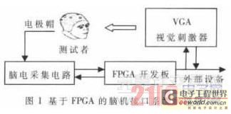 腦機(jī)接口系統(tǒng)是由人和機(jī)器構(gòu)成的閉環(huán)系統(tǒng)[3]。除人本身外, 腦機(jī)接口系統(tǒng)包括:信號采集、信號處理、外部設(shè)備及控制部分。本文的方案采用FPGA取代計(jì)算機(jī),作為腦機(jī)接口的控制和信息處理器。主要包括腦電采集電路、基于FPGA的VGA視覺刺激器和FPGA開發(fā)板三部分,如圖1所示。