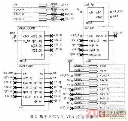 本文的方案是基于FPGA的VGA視覺刺激器,采用VGA顯示器作為視覺刺激器,通過VHDL編程的方式產(chǎn)生圖形刺激信號。FPGA是一種半定制電路,具有很強(qiáng)的在線修改能力,可以隨時(shí)修改設(shè)計(jì)而不必改動(dòng)硬件電路。因此,通過編程可以靈活地產(chǎn)生不同的刺激模式,修改和升級十分方便。按照VGA顯示器逐行掃描的工作原理和VGA工業(yè)標(biāo)準(zhǔn)[5],在FPGA中設(shè)計(jì)了VGA控制器,包括分頻模塊、掃描時(shí)序產(chǎn)生模塊、圖像描述模塊、刺激頻率控制模塊和光標(biāo)控制模塊,其框圖如圖2所示。