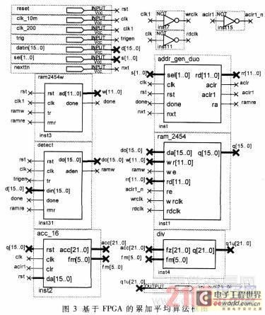 累加平均方法是最經(jīng)典的誘發(fā)電位信號處理方法,也是電生理測量中提高信噪比最常用的方法[2]。在FPGA中設(shè)計(jì)的累加平均算法的框圖如圖3所示,包括觸發(fā)信號檢測模塊、RAM地址控制模塊、異步雙口RAM、累加器和除法器。