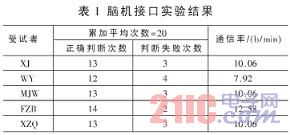 腦機(jī)接口的實(shí)驗(yàn)結(jié)果如表1所示,受試者是5名健康男性。正確判斷時(shí),在刺激模塊停止閃爍的同時(shí),光標(biāo)立刻移向受試者注視的模塊。