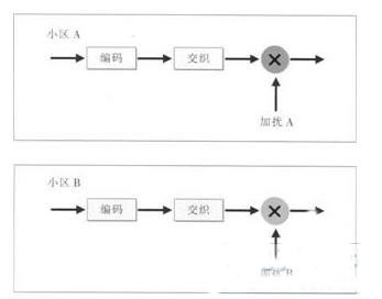 a)小區專屬加擾,即在信道編碼后,對干擾信號隨機加擾。如圖l所示,對小區A和小區B,在信道編碼和交織后,分別對其傳輸信號進行加擾。如果沒有加擾,用戶設備(UE)的解碼器不能區分接收到的信號是來自本小區還是來自其他小區,它既可能對本小區的信號進行解碼,也可能對其他小區的信號進行解碼,使得性能降低。小區專屬加擾可以通過不同的擾碼對不同小區的信息進行區分,讓UE只針對有用信息進行解碼,以降低干擾。加擾并不影響帶寬,但是可以提高性能。