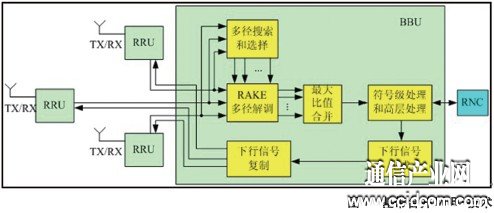 基帶合并MRRU技術的原理如圖1所示:在上行方向,多個RRU接收的信號分別送入BBU,BBU對各個RRU信號進行多徑搜索和RAKE解調,并把解調的各個RRU信號進行最大比值合并,再進行后續處理。下行方向,生成的下行信號復制成多份發送給各個RRU,從而實現了全小區方式的效果。中興通訊MRRU合并小區技術是在基帶實現,不會抬升小區底噪。