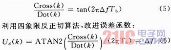 常用的消除符號模糊的CPAFC方法其誤差函數為Ud(k)=Cross(k)×sign(Dot(k)),其鑒頻特性是非線性的,且鑒頻范圍為(-Rb/4,Rb/4),將其改進,點積和叉積之間存在如下關系: