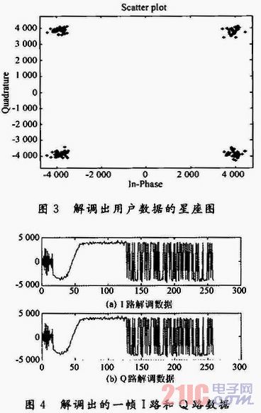 由仿真結果可以看到,FLL工作的起始頻率是4 375 Hz,這是由于FFT校頻后,算法找到了625 Hz整數倍且離4 600 Hz最近的一根譜線,之后約43次FLL環路校正后達到了離4 600 Hz大約10 Hz處,此時FLL停止,PLL啟動鎖定剩余頻差和相差。加上做FFT的16個符號,大約使用了59個導頻符號。這與解調出來的I路和Q路中前約59個符號是錯誤相符合。之后解調出來的都是正確的導頻符號1。而一幀信號變為260 b是由于前面的40 b被用于信號捕獲和多普勒頻率掃描。解調出用戶數據的星座如圖3所示,圖中給出了鎖定后去除導頻符號,恢復出來用戶數據的情況,可以看到載波恢復效果很好。解調出的一幀1路和Q路數據如圖4所示。