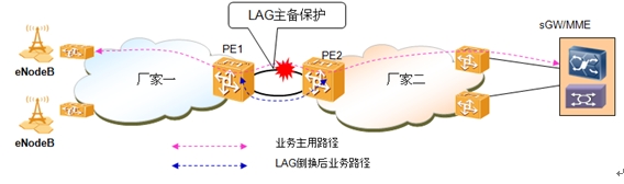 在PE1上配置經(jīng)過PE2的一條靜態(tài)路由,目的IP為SGW/MME,PE2上配置經(jīng)過PE1的一條靜態(tài)路由,目的IP為基站的網(wǎng)段IP,為了提高可靠性做跨板卡的LAG保護。第二種方式為NNI側(cè)互通,需要不同廠家互通OAM保護倒換等控制信息,開通測試和標簽協(xié)商難度都很大而且運維困難,出現(xiàn)故障定界難,一般不推薦使用。