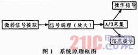 一般信號在使用前,需要先濾波后放大,或者先放大后濾波,然后經過A/D等手段獲取(感知)信號。對于小信號而言,信號幅值只有幾毫伏,甚至更小,如果先濾波,可能會將有用信號濾除,因此,在這種情況下,需要先進行放大,然后濾波,再進行A/D轉換或其他處理。根據本系統特點,系統中存在的干擾可以忽略,因此不考慮信號濾波環節,因此,系統主要通過信號提取、信號放大、A/D采集3個重要環節實現。第3個環節產生的數據,可以指導人們的工作,或顯示相關的信息。整個系統原理框圖如圖1所示。