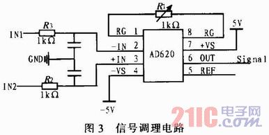調理后的信號經過AD620的6腳輸出,此時可直接接入A/D轉換芯片,實現數據采集,使用時縮小相應倍數即可。信號調理原理如圖3所示。