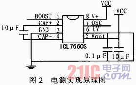 AD620作為一個放大器,可以使用單電源或者雙電源工作,但是使用雙電源工作時,其性能優于單電源。在集成電路設計中,單電源易于實現,但考慮到芯片的工作性能,本系統中采用雙電源供電。利用ICL7660S芯片,將外部單電源轉換為雙電源。ICL7660S是一個電壓轉換芯片,可以實現由正電壓轉換為負電壓的功能,其外圍電路也比較簡單,具體電路如圖2所示。