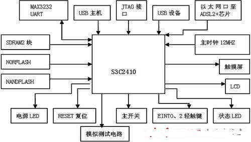本儀表要求具有液晶顯示及觸摸屏等部分,因此在要求高速數(shù)據(jù)處理能力同時(shí),也要求相當(dāng)?shù)目刂颇芰Γ到y(tǒng)采用的ARM9系列32位微控制器S3C2410X頻率可達(dá)203MHz,能夠輕松運(yùn)行WinCE、Linux等操作系統(tǒng)以及進(jìn)行較為復(fù)雜的信息處理。同時(shí),采用5英寸STN液晶屏直觀的顯示各項(xiàng)測試指標(biāo),彌補(bǔ)了現(xiàn)有測試工具顯示效果的缺陷。使用觸摸屏代替鍵盤輸入部分,使便攜優(yōu)勢更為突出。考慮到操作系統(tǒng)運(yùn)行及大量高速數(shù)據(jù)處理的需要,系統(tǒng)采用了兩塊32M SDRAM,一塊32M NAND Flash及一塊2M NOR Flash,程序、操作系統(tǒng)及測試數(shù)據(jù)保存于NAND Flash中,系統(tǒng)從16位NOR Flash引導(dǎo)啟動(dòng)。