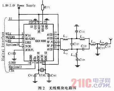 CC1100的工作狀態有IDEL(待機)、RX(接收)、TX(發送),同時支持遠程喚醒功能,這樣可以降低功耗。主要的引腳為VCC電源輸入(1.9~3.6V)、SI數據輸入、SO數據輸出、SCLK時鐘輸入、GD00和GD02為數字輸出供測試系統使用,CSN為芯片片選信號。芯片內置64 Byte的TX和RX緩沖器。文中設計了圖2所示的無線電路。數據操作通過STC11F32XE單片機的SPI口進行。