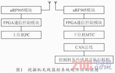 液壓挖掘機(jī)的無線監(jiān)控?cái)?shù)據(jù)傳輸系統(tǒng)采用上下位機(jī)雙層控制結(jié)構(gòu),上下位機(jī)之間采用了點(diǎn)對點(diǎn)通訊模式。上位機(jī)采用PC機(jī),主要完成遠(yuǎn)程監(jiān)控、數(shù)據(jù)存儲處理和運(yùn)動(dòng)軌跡規(guī)劃運(yùn)算等工作。下位機(jī)安裝于挖掘機(jī)上,采用Inter Control公司的機(jī)載電腦。MTC通過CAN總線傳輸各傳感器數(shù)據(jù)和油缸電磁閥開口大小信號,進(jìn)行挖掘機(jī)狀態(tài)數(shù)據(jù)的采集和電磁閥等執(zhí)行機(jī)構(gòu)的驅(qū)動(dòng)等。各傳感器、油缸電磁閥和機(jī)載電腦之間通過CAN總線通信。編程工具是工控領(lǐng)域常用的CoDeSvs。采用通訊頻段為433MHz、通訊最大距離為500m的無線數(shù)傳輸模塊nRF905進(jìn)行無線數(shù)據(jù)傳輸。nRF905有4種工作模式:掉電模式、待機(jī)模式、發(fā)射模式、接收模式。無線監(jiān)控?cái)?shù)據(jù)傳輸系統(tǒng)采用FPGA作為通信控制模塊,使用SOPC技術(shù)搭建片上硬件系統(tǒng)。通信控制程序使用C語言編寫。FPGA通過GPIO口控制nRF905的三組引腳:TX_EN、TRX_CE和PWR來設(shè)置nRF905不同的工作模式;載波儉測輸出CD、地址匹配輸出AM和數(shù)據(jù)就緒輸出DR用于通知FPGAnRF905的收發(fā)狀態(tài);SPI接口用于配置、發(fā)送和接收數(shù)據(jù)。系統(tǒng)硬件結(jié)構(gòu)框圖如圖1所示。