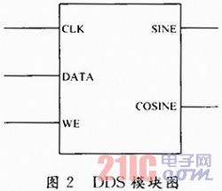 FPGA產生正弦波一般可以采用直接產生和Xilinx或者Altera利用自帶DDS的IP核例化實現。FPGA直接產生是將三角函數值存入ROM中循環調用來產生正弦波,這樣占用的邏輯資源比較少,缺點就是過程很麻煩而且不夠靈活,模型需要8種頻率的正弦波和余弦波,而且fm也可能根據需要而變化,每一次變化就需要在ROM中重新賦初值,十分麻煩。因此本文選擇調用Xilinx自帶DDS的IP核,通過邏輯資源換取效率。DDS的模塊圖如圖2所示。