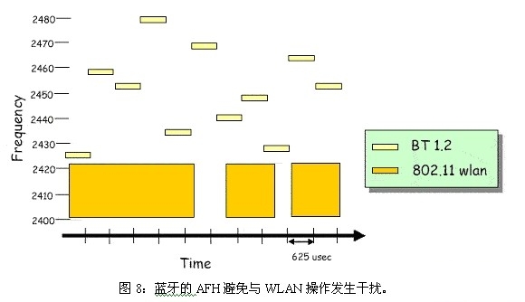 但是問題隨之而來:在采用WLAN與藍牙技術的匯聚設備中,WLAN是否能夠從AP不斷接收下載內容,而不必考慮該設備藍牙子系統的操作模式?經過對藍牙實施制定仔細的設計、規劃與部署決策,答案是肯定的。首先,設計人員必須利用藍牙1。2的功率控制(第3類設備)功能,以及藍牙的自適應跳頻(AFH)。下面的圖8展示了AFH如何避免與WLAN操作發生直接的帶內干擾。