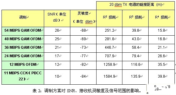 表2顯示了802.11g與802.11b的不同調制方案如何影響SNR、接收機靈敏度及信號范圍。請注意,采用CCK調制的802.11b與采用PBCC調制的802.11b具有相同的SNR。