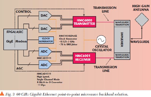 Hittite HMC6000/6001芯片組和封裝好的器件是理想的60GHz應(yīng)用及整合,包括室外點(diǎn)對點(diǎn)連接和室內(nèi)消費(fèi)類設(shè)備。圖3是一個(gè)典型的通過60GHz鏈接點(diǎn)對點(diǎn)微波傳輸幾個(gè)Gbps以太網(wǎng)數(shù)據(jù)流框圖。這些是全雙工的連接,雙工器常被用到必要的收發(fā)兩路的隔離,同時(shí)又共用一個(gè)高增益天線。早期60GHz點(diǎn)對點(diǎn)系統(tǒng)需要很多分離器件來構(gòu)造的無線部分非常昂貴,尺寸較大,功耗較高。Hittite的集成套片方案把無線部分用兩個(gè)芯片和一個(gè)晶振,以及互聯(lián)挑戰(zhàn)被降低到兩個(gè)近距離傳輸線到雙工器。