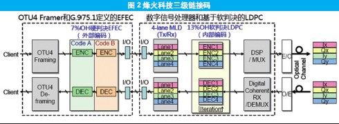 烽火科技100G DWDM采用了基于數字相干接收PM-QPSK調制技術,其糾錯編碼采用7%硬判決和13%軟判決結合的方式,分別置于framer和ASIC中,如圖2所示。其中,7%的硬判決糾錯編碼為G.975.1所定義的二級鏈接碼,13%軟判決糾錯編碼為低密度奇偶校驗編碼(LDPC),這種組合實際上構成三級鏈接碼。