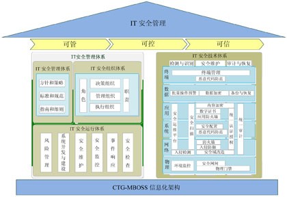 中國電信IT安全保障體系以CTG-MBOSS信息化架構為基礎,是支撐企業IT安全建設和管理的基礎架構,整個體系以IT安全戰略為指導,將組織、策略、運行、技術等安全各方面要素結合起來,通過安全管理制度的逐一落實,安全防護措施的統一部署,循序漸進的構建一個科學全面的信息安全保障體系。體系建設和實施路線遵循“管技結合、預防為主、注重長效、循序漸進”十六字方針,按照“職責明晰、預防為主、有效識別;主動防御、及時響應、集中管控;體系完善、流程通暢、全員參與” 的路線向“可管、可控、可信”三個階段能力目標演進,最終實現可信賴的IT安全運營環境愿景,整體安全保障體系框架如圖1所示。