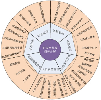 中國電信IT安全基線達標標準,從管理和技術兩個維度對如何考察安全建設能力給出了詳細的達標評比辦法,將安全能力分為C級、B級、A級。分為組織架構管理、人員安全管理、運維安全管理、應用安全、主機安全、網絡安全、審計安全管理七大項。一個完整的安全基線保障體系應該是將安全管理和安全技術手段相結合,通過各種安全管理制度、安全組織機構和安全運維制度等方面的建設,并在網絡層、主機層、應用層采取各種安全技術手段建立多層保護的深度防御保障體系。從安全基線可操作性的角度出發,在安全管理層面應將組織架構管理要求、人員安全管理要求和運維安全管理要求等三部分作為IT系統安全的基線考評要求,在安全技術層面應將應用安全要求、主機安全要求、網絡安全要求和安全審計要求等4部分作為IT系統安全的基線考評要求,通過建立健全IT系統管理與技術防護體系,逐步提升IT系統整體安全防護能力。IT安全基線評分標準如圖2所示。