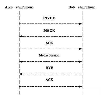 一個簡單的SIP 會話流程如圖2 所示。首先Alice給Bob 發送INVIte 消息邀請Bob 加入SIP 會話,INVITE 消息中攜帶了描述Alice 的音視頻編解碼格式和通信端口的SDP 信息,Bob 收到INVITE 消息后,發送200 OK 消息給Alice,200 OK 消息中攜帶了描述Bob 所選擇的編解碼格式和Bob 通信端口的SDP信息,Alice 收到200 OK 消息后發送ACK 消息給Bob,此時完成三次握手,進入媒體會話階段。媒體會話完成后,Bob 發送BYE 消息給Alice 結束SIP 會話,Alice 收到BYE 消息后,給Bob 發送ACK 確認消息。