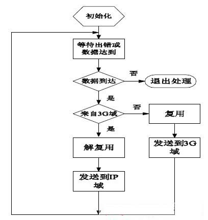 網關的主要工作是在3G 域與IP 域之間進行控制消息和媒體格式的轉換,主程序的設計首先進行3G-324M 協議棧等各種數據結構的初始化,然后在3G 域和IP 域兩個通道同時監聽數據的到達。如果從監聽返回的時候沒有數據到達,則意味著某個通道出錯,此時進行退出處理;如果從監聽返回是因為3G域通道有數據到達,則將收到的數據根據3G-324M協議解復用后進行格式轉換發送到IP 域的通道;如果從監聽返回是因為IP 域通道有數據到達,則轉換格式后根據3G-324M 協議復用并發送到3G 域通道。在后兩種情況下,進行完數據轉發后,繼續回到監聽3G域通道和IP 域通道的狀態。程序流程圖如圖5 所示。