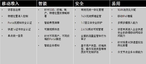 Wi-Fi在企業的大規模應用,使得從任意位置根據策略訪問桌面,無論使用何種設備或網絡成為可能。根據前面前文的分析,為了解決IT管理人員和用戶自身在BYOD實施中的困難和疑惑,Wi-Fi網絡應該具備相應的能力(如表1所示)。