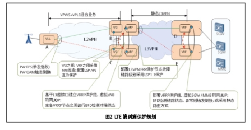為了解決以上問題,在PTN網絡核心層引入靜態L3 VPN技術,同時為了滿足網絡的健壯性及安全性,還需要部署豐富的保護功能,如PW FPS、LSP APS、VRRP、BFD for StaticRoute等。由此在整個LTE部署中,PTN承載網絡的前期規劃,包括網絡架構、帶寬需求、安全性等多方面就顯得尤為重要。
