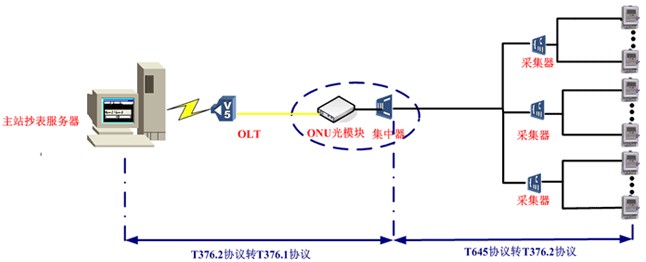 電能表至電能表模塊之間采用T645協議,電能表模塊至采集器和集中器模塊之間采用T376.2協議,集中器模塊至ONU模塊和主站之間采用T376.1協議,ONU模塊在之間只起著透傳作用。集中器模塊負責協議轉換,ONU模塊并不做任何協議處理,只負責透傳。