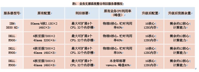 以某地市運營商IT系統為例。IT支撐系統虛擬化整合基于初期搭建平臺預算及保障業務正常運轉需求的考慮,從該地市50個系統中選出33個系統,共計34臺服務器進行虛擬化整合。系統整合利用原有支撐系統的4臺服務器進行升級、虛擬化后形成資源池。4臺系統服務器的利舊、升級情況如表1所示。