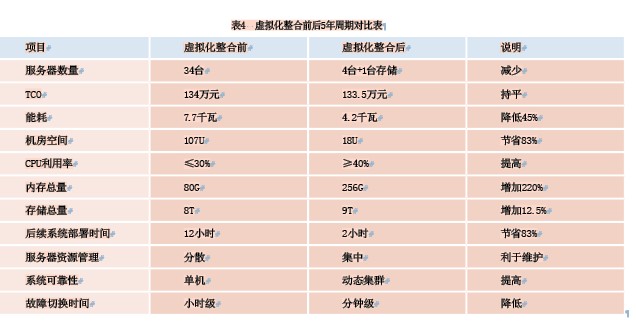 由上面的分析可以看出,虛擬化整合前TCO約為100+34=134萬元;虛擬化整合后TCO約為119+14.5=133.5萬元。整個項目5年內的TCO投資大體持平。此外通過虛擬化整合,將大大減少服務器的數量從而獲得大約89U的機房空間以及大約10臺可以再次利舊的服務器(整合后剩余的雙核服務器)。整個業務支撐系統虛擬化整合項目5年內前后對比如表4所示。