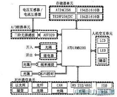 微機保護裝置將待保護系統送來的電流、電壓信號,經電流、電壓互感器變換后產生低電壓信號送入主模板。主模板內的AT91RM9200運行片內的保護軟件,進行信號采樣,完成各種數值運算、分析及處理,從而確定待保護系統的運行狀態。如有故障,則由處理器經模板發出跳閘動作信號,以保護系統。同時通過各種通信方式將保護動作信息送入管理模板和上位機,記錄和保存數據并報警。硬件系統采用模塊化設計,可分為電流互感器/電壓互感器模塊、A/D轉換單元、開入/開出單元、人機交互單元、存儲器單元、對外通信單元及電源模塊等,硬件主體結構如圖1所示。