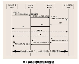 IMS網(wǎng)絡(luò)中,通信雙方支持語(yǔ)音、視頻、文本等多種媒體格式進(jìn)行交流,雙方經(jīng)過(guò)媒體協(xié)商后,可以選定一種合適的媒體格式進(jìn)行通話。具體媒體協(xié)商流程如圖1所示。