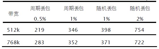 多次改變呼叫帶寬和網絡丟包率,反復試驗,得到的不同環境下由傳輸引起的音視頻時間差如表1 所示。