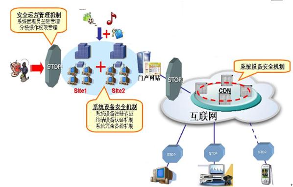 網(wǎng)絡(luò)應(yīng)用安全面臨著混合型危險的挑戰(zhàn)。單一安全設(shè)備的投入,從某種方面而言僅僅能夠解決局部風(fēng)險,并不能從整體上將整個系統(tǒng)風(fēng)險降低到可接受水平;因此,綜合型安全設(shè)備、系統(tǒng)安全性設(shè)計、完善的管理機(jī)制綜合使用是構(gòu)建安全的互聯(lián)網(wǎng)應(yīng)用的必由之路。奔流互聯(lián)網(wǎng)電視(OTT)解決方案包含了全面的安全機(jī)制,主要由以下部分組成: