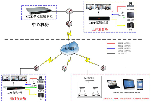 1、系統(tǒng)采用軟硬件結合的模式。主要的會場采用硬件設備,保障系統(tǒng)穩(wěn)定運行;經常出差的與會者不在會議室,用PC、智能手機、PAD、無線終端也能同樣入會,在3G、4G、WIFI、衛(wèi)星網絡環(huán)境下即可高清晰的、流暢的視頻通訊,方便差旅過程中的視頻通信應用,有效地加強了會議的便捷性。