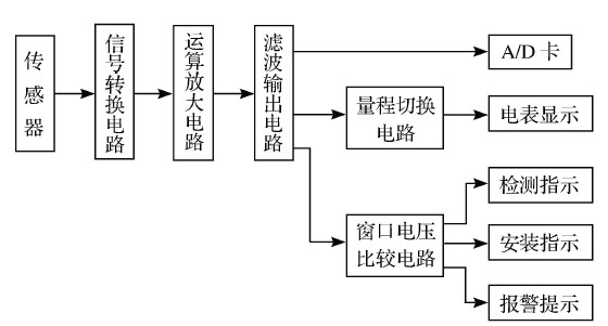 圖1為測頭電路系統結構框圖。測頭電路系統主要由信號轉換電路、運算放大電路、濾波輸出電路、量程切換電路和窗口電壓比較電路五部分組成。傳感器輸出交流電壓信號,電壓值與傳感器磁芯位置成正比,經過信號轉換電路將其轉換為相應的直流電壓信號。運算放大電路對直流電壓信號進行放大,以滿足后續電路的電壓需求;放大后的直流信號經過濾波輸出電路輸出到A /D 卡,在計算機控制下實現自動檢測;同時,濾波信號經量程切換電路,將直流電壓信號以對應電表不同量程的位移值得以顯示,從而提供直觀的測量結果;濾波信號經窗口電壓比較電路可檢測到測頭位移狀態,分別以檢測、安裝、報警等狀態顯示輸出,保證了安裝和檢測過程的安全。