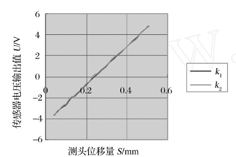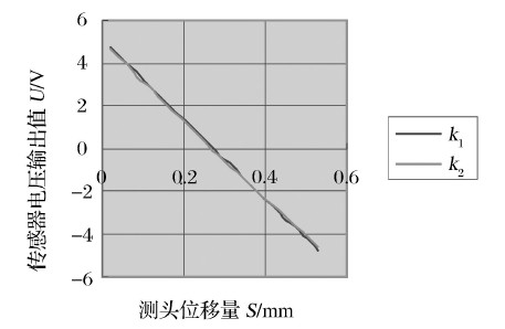 用一等環規檢定裝置和數字電壓表對測頭的左、右齒面位移測量進行標定,標定方法采用靜態特性標定法,標定試驗記錄見圖3、圖4.圖中,k1 , k2 分別表示測頭從零位運動到最大位移量和從最大位移量運動回零位測頭的靈敏度。