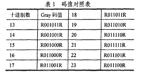 編碼采用格雷碼(Gray)為數值碼,以某一固定碼寬為參考碼R,它用于標尺定位和提高精度。Gray碼是一種絕對編碼方式的無權碼,它所具有的循環、單步特性能消除隨機取數時出現重大誤差的可能,其任意兩個柏鄰整數之間轉換時,只有一個位數發生變化,大大減少了由一個狀態轉到下一個狀態時的邏輯混淆,具有較強的容錯能力。以6位編碼為例,其部分十進制數與Gray碼的一一對應關系如表1所示。
