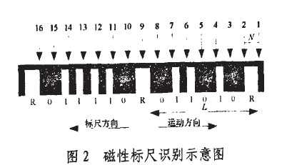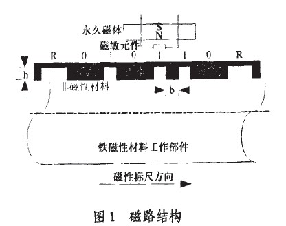 根據磁敏傳感原理,“凹槽”和“凸槽"會導致不同的磁場強度,從而使磁敏元件相應地輸出不同的電半信號“0”或“1”,形成數值碼,用于確定位移的粗讀值;而標志位R碼寬兩倍于碼元“1”寬度的特點,使得識別后的序列出現具有固定特征的標識碼,它用于精讀數。