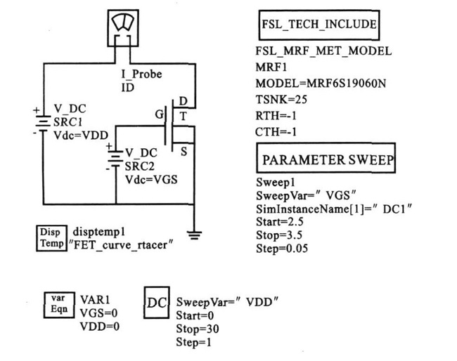 靜態工作點仿真主要是選擇放大器的工作狀態,確定靜態工作點。根據仿真步驟首先在ADS 中導入飛思卡爾的LDMOS 模型庫,并調出MRF6S19060N 模型。建立如圖1 所示的直流仿真電路圖。