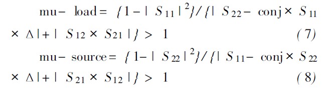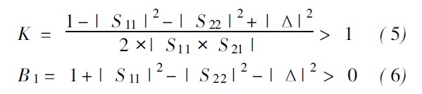 放大器電路必須滿足的首要條件之一是其在工作頻段內的穩定性。因為射頻電路在某些工作頻率和終端條件下有產生振蕩的趨勢。它一般取決于晶體管的S 參數和置端條件。功率放大器的穩定性可以根據穩定因子來判定,計算公式如下: