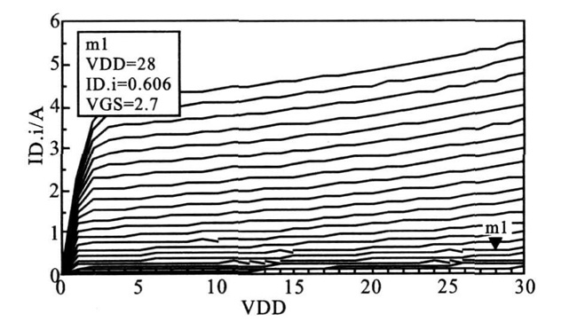 在晶體管的技術參數中,需要通過仿真和實際測試獲得柵極電壓。圖2 為MRF6S19060N 晶體管的靜態工作點特性曲線。在特性曲線中,可以發現靜態工作點即圖2 中m1 點,V DD= 28V, I DQ = 0.606A, 從而得到柵極電壓VGS = 2. 7V, 這樣靜態工作點就確定了。