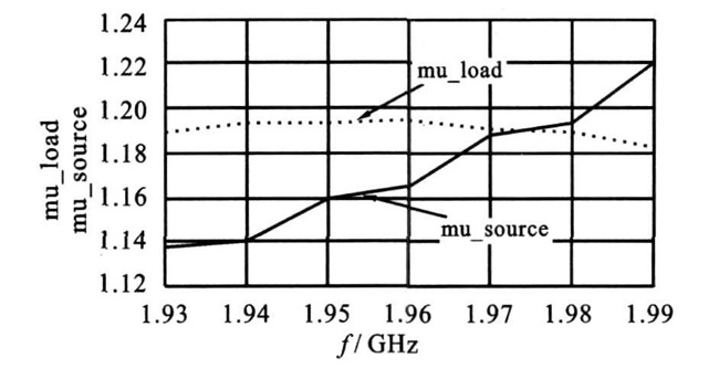 如果因不穩定在輸入或輸出端口出現負阻時,就可能發生振蕩,則需要采用在輸入或輸出端串聯或并聯負反饋的方法使晶體管穩定。仿真實例中采用ADS 自帶mu- load 和mu- source 公式滿足的條件來判定功率放大器穩定性,通過仿真可以得到器件的穩定性曲線如圖3 所示。由下圖仿真結果可見在工作頻率范圍內mu- load 和mu- source 都大于1 滿足絕對穩定的條件。