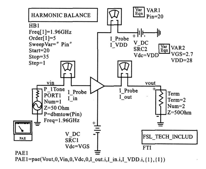 單音信號仿真是掃描功率的諧波平衡仿真,主要是得到ldB 壓縮點和放大器的功率附加效率曲線。圖5 是單音信號仿真電路圖,這里頻率設定為中心頻率1960MHz.