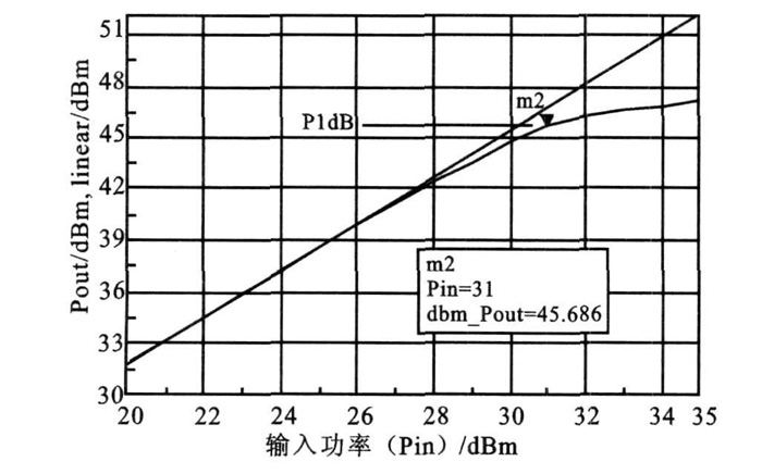 同時還仿真了理想輸出功率和增益壓縮輸出功率與輸入功率的關系曲線。