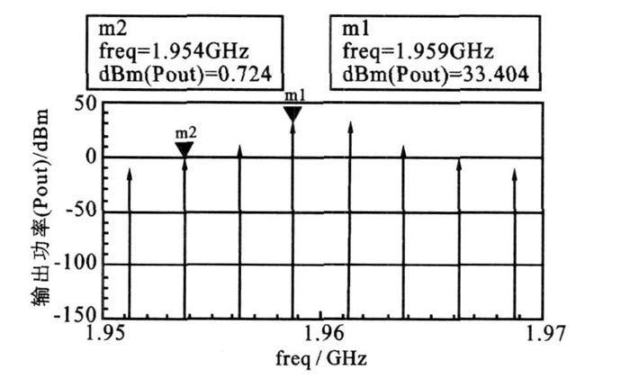 雙音信號仿真是測試放大器線性度的重要手段,它是將頻率相近的射頻信號輸入到放大器,利用諧波平衡法,得出放大器輸出信號中的三階互調失真分量與基波信號的相對關系。將輸入的雙音信號頻率分別設置為1958. 75MHz. 和1961. 25MHz的正弦信號,則三階互調失真的頻率分別為1953.75MHz 和1966. 25MHz. 圖8 為雙音信號的仿真結果。由仿真結果可以計算出IMD3 為- 32. 68dBc.