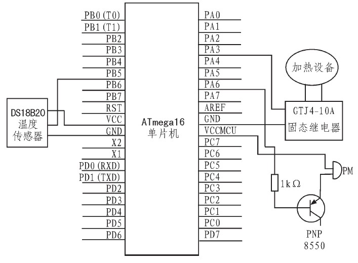 本系統主要采用高性能AVR單片機,GTJ4-10A固態繼電器,DS18B20溫度傳感器,報警輸出電路。主要系統電路圖略。